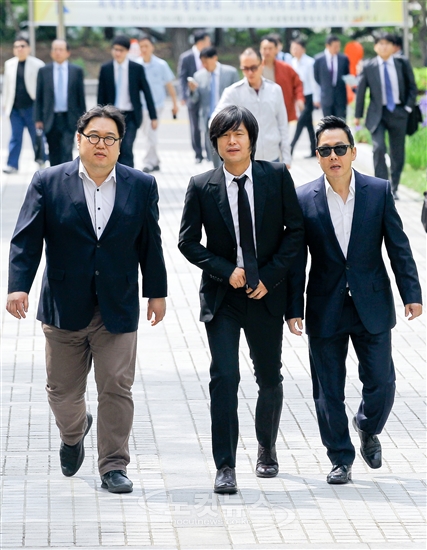 주진우 시사IN기자(가운데)가 공직선거법상 허위사실 공표 혐의로 영장실질심사를 받기 위해 김용민 시사평론가(왼쪽), 정봉주 전 의원과 함께 14일 오전 서울 서초구 서초동 중앙지방법원으로 들어서고 있다.