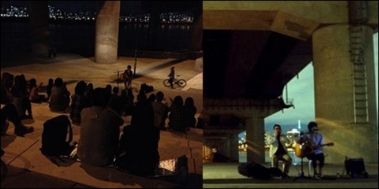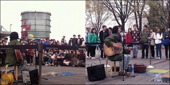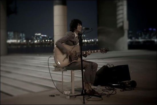 브라운아이드소울 콘서트에 게스트로 무대에 오른 적도 있고 홍대 클럽 공연도 했다. 그래도 대부분은 길거리가 그의 무대였다. 인천 터미널에서 처음 버스킹을 시작했고 때론 벚꽃이 좋아서 가로등 밑이 좋아서 옮겨 다녔다. 그 중 한강다리 밑은 특별하다.