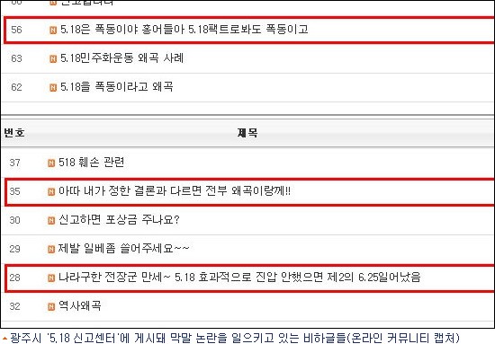 한편 광주시 홈페이지에 ''''신고센터'''' 게시판이 개설된 이후 수많은 네티즌들이 5·18 민주화운동을 비하한 게시물을 신고하기 시작했다. [BestNocut_R]