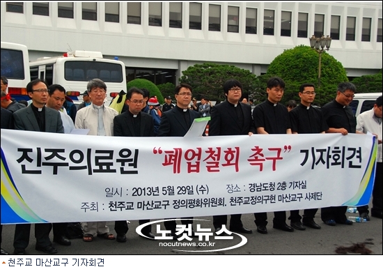 천주교 마산교구 정의평화위원회와 정의구현 마산교구 사제단은 29일 경남도청 앞에서 기자회견을 열고 진주의료원 폐업 철회를 촉구했다.