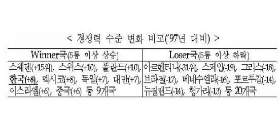 IMD는 97년(30위)과 2013년(22위)의 순위변화를 기준으로 한국을 ''승자(Winner)국가''로 분류했다. 비교대상 60개 국가 중 97년과 비교해 순위가 5단계 이상 오른 승자 국가는 우리나라를 포함 스웨덴과 폴란드, 독일, 중국 등 9개에 불과했다.