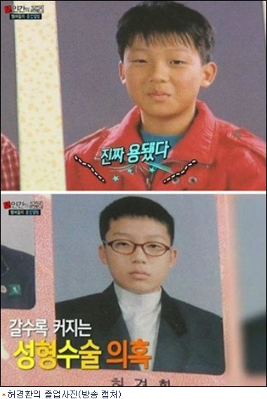 사진을 본 멤버들이 놀라움을 금치 못하며 성형의혹을 제기하자 허경환은 "그땐 공부를 잘했다. 공부밖에 모르던 시절"이라고 해명했다.