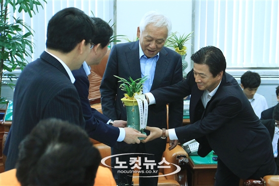 최경환 새누리당 원내대표(왼쪽에서 두번째)가 3일 오전 서울 여의도 국회 민주당 대표실에서 김한길 대표를 예방, 난을 선물하고 있다.