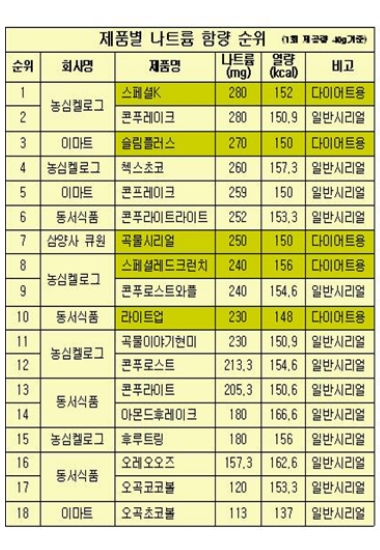 18개 제품 가운데 나트륨 함량이 가장 높은 것은 농심켈로그의 ''스페셜K''로 40g당 나트륨 함량은 280mg에 이르렀다.
