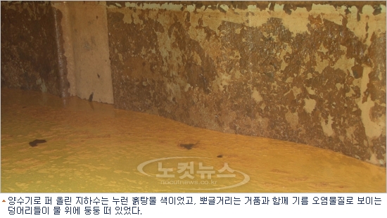 저장탱크의 뚜껑을 열어젖히자 양수기로 끌어올린 누런 지하수가 눈에 들어왔다. 뽀글거리는 거품과 함께 기름 오염 물질로 보이는 덩어리들이 곳곳에 둥둥 떠 있었다.