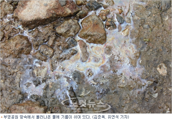 공원 입구를 들어서자 햇볕이 쨍쨍 내리쬐는 맑은 날씨임에도, 땅속에서 기름이 섞인 물이 흘러나오고 있었다.