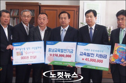 NH농협은행 충남본부(본부장 윤동기)와 (사)우리농업지키기 운동본부(본부장 류병관)는 5일 충남교육청(부교육감 전찬환)을 방문해 충남교육발전기금 1억 5천만원과 서해안 유류피해지역 교육발전 지원금 4천 5백만원 등 모두 1억 9천 5백만원과 우리농산물 창작동화책 ''날아라 당근 우주선'' 900권을 전달했다.