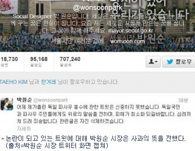 박원순 시장이 최근 논란이 되고 있는 트위터 게시물을 삭제하고 사과의 뜻을 전했다.