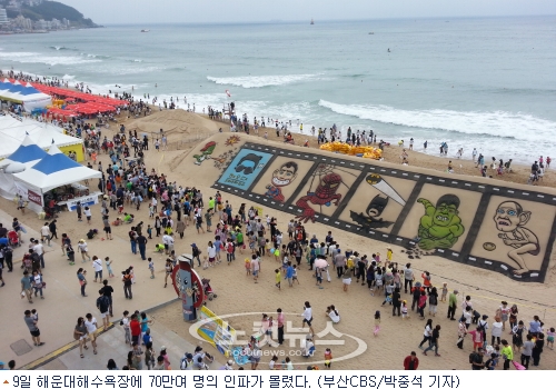 9일 국내 유일의 친환경 축제인 ''해운대 모래축제''가 열리고 있는 해운대해수욕장에는 70만여 명의 인파가 몰려 한여름 피서철을 방불케 했다.