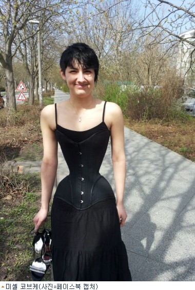 10일 미국 매체 뉴욕데일리뉴스 등 외신들은 독일 베를린에 살고 있는 미셸 코브케(24)가 먹을 때나 잠잘 때, 수영할 때도 코르셋을 벗지 않고 있다고 소개했다.