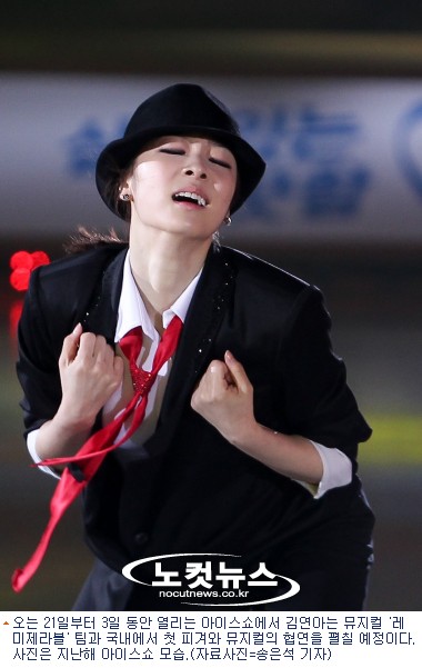 ''피겨 여왕'' 김연아(23)가 아이스쇼에서 뮤지컬 ''레 미제라블'' 팀과 콜라보레이션(협연)을 펼친다. 오는 6월 21일부터 3일 간 서울올림픽공원 체조경기장에서 열리는 ''삼성 갤럭시★스마트에어컨 올댓스케이트 2013''에서다.