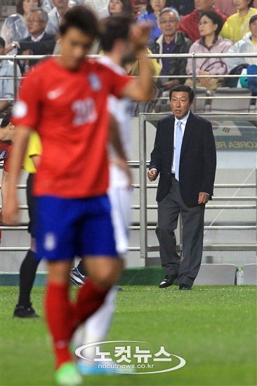 11일 오후 상암동 서울월드컵경기장에서 열린 2014브라질월드컵 아시아지역 최종예선 A조 7차전 대한민국과 우즈베키스탄의 경기에서 최강희 감독이 지시하고 있다. 앞으로 이동국이 걸어가고 있다.