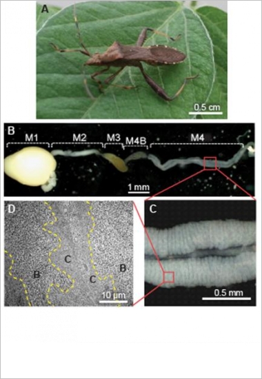 그런데 이 교수팀은 일본 산업기술종합연구소 후카츠 박사와 함께 콩이나 벼의 즙액을 빨아 먹고 사는 톱다리 개미허리 노린재와 그 장에 사는 공생균 벅홀데리아의 공생모델 시스템을 구축했다.