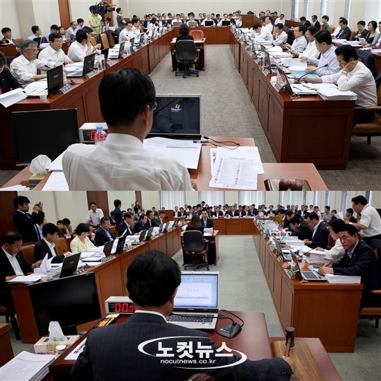 상임위 첫날인 17일 오전 서울 국회의사당에서 기획재정위원회(위쪽)가 더위로 인해 양복 상의를 탈의한 채 회의를 하고 있다. 안전행정위원회(아래쪽)는 평상시대로 진행됬다.