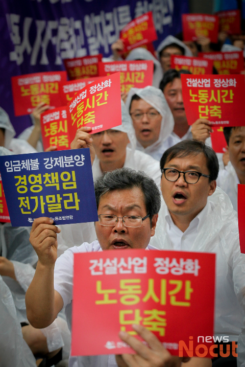 18일 오후 전국건설기업노동조합연합 주최로 서울 중구 정부종합청사에서 열린 '건설기업 노동자 생존권 사수와 건설산업 정상화 촉구 결의대회'에서 참가자들이 구호를 외치고 있다.