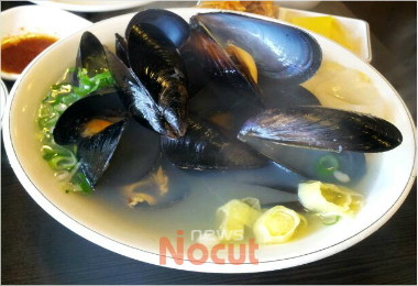 만두국은 거의 맑은 홍합탕 수준의 홍합이 껍질째 듬뿍 얹어져 나오는 이색적인 비쥬얼을 선보인다.