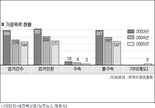 전북지방경찰청에 따르면 지난해 발생한 가정폭력 사건은 179건(검거인원 203명)이지만 접수되지 않은 사례가 훨씬 많을 것으로 경찰은 예상한다. 올 11월까지 가정폭력으로 2명이 구속되고 167명이 불구속 입건됐다.