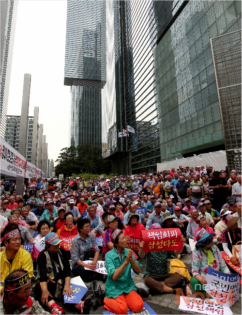 2일 오후 서울 삼성전자 서초 사옥 앞에서 원유유출사고 서해안 유류피해민들이 '삼성 책임 궐기대회'를 열고 있다.