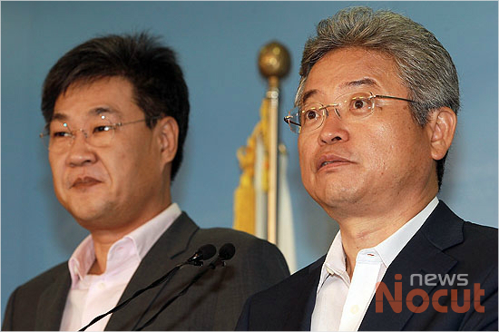 국정원 국정조사 특위 새누리당 소속 이철우 의원(오른쪽)과 정문헌 의원이 9일 오전 국회 정론관에서 특위 위원직 사퇴 기자회견을 갖고 있다.