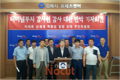이마트ㆍ신세계백화점 입점반대 추진위원회는 8일 김해시청에서 기자회견을 열고, 감사원이 감사 청구를 기각한 데 대해 "감사원이 본래의 직무를 망각했다"며 "감사결과를 받아들일 수 없다"고 주장했다.