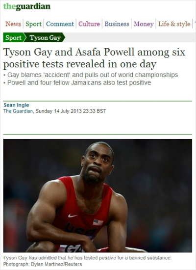 한편, 100m 전 세계기록 보유자 아사파 파월(자메이카)도 지난 6월 자메이카 선수권대회에서 실시한 도핑테스트에서 양성 반응을 보였다. 게이와 달리 파월은 “고의로 규칙을 어기고 금지약물을 사용한 적이 없다”며 검사 결과를 부인했다.
