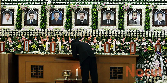 18일 오후 서울 구로구 고려대학교 구로병원 장례식장에 마련된 노량진 수몰 희생자 7명의 합동분향소에서 유족이 분향하고 있다.