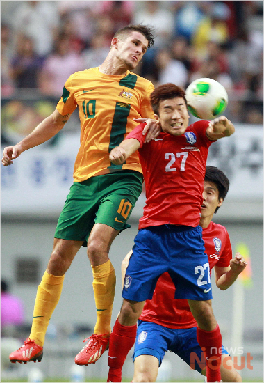 20일 서울 상암월드컵경기장에서 열린 2013 동아시아축구연맹 선수권 대회 호주와의 대표팀 1차전 경기에 고요한 선수가 호주 수비수와 공중볼을 다투고 있다.