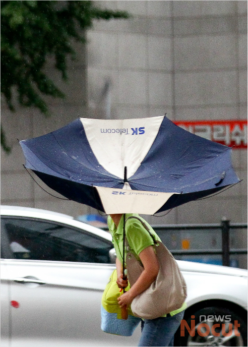 중부지방을 중심으로 장맛비가 내리는 23일 오전 서울 강남역 인근 도로에서 한 시민의 우산이 돌풍에 뒤집어지고 있다.