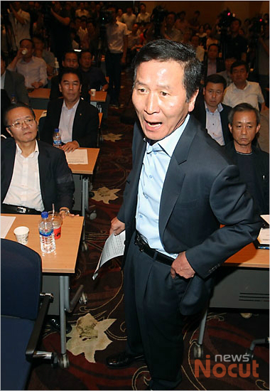 30일 오전 서울 여의도 중소기업중앙회에서 열린 개성공단 전체 입주기업 비상대책회의에서 정기섭 비대위 기획분과위원장(오른쪽)이 공동위원장단에게 전일 합의한 내용이 아닌 다른 내용이 포함된데에 이의를 제기해 회의가 정회됐다. 사진은 항의하는 정 위원장.