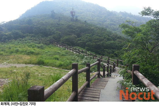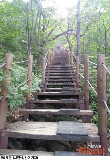 화개재에서 1,2백미터를 오르면 길이 3백m의 계단길이 나타난다. 나무계단만 무려 585개(얼추 계산)를 올라야 하는 구간이다.