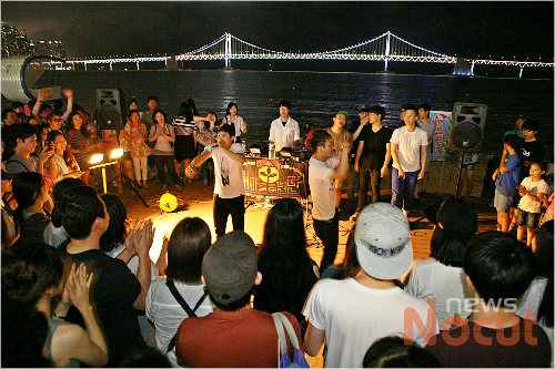 낮 동안 뜨거웠던 부산 바다의 열기는 해가 저도 식을 줄 모른다. 해변을 무대로 펼쳐치는 거리공연 이른바 '버스킹'이 확산되면서 해변을 달구고 있기 때문이다.
