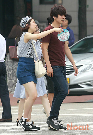 30도를 웃도는 찜통더위가 기승을 부리고 있는 9일 오후 서울 오목교역 인근에서 시민들이 부채질을 하며 횡단보도를 건너고 있다.