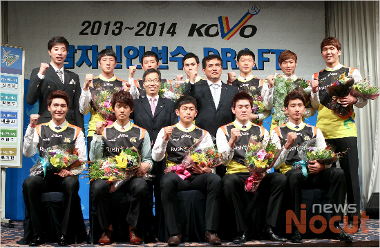 12일 오후 서울 청담동 리베라호텔에서 열린 '2013~2014 남자배구 신인드래프트'에서 러시앤캐시에 지명된 선수들이 김세진 감독과 포즈를 취하고 있다.
