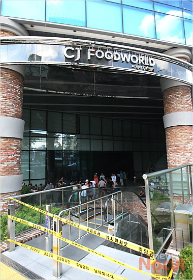 국세청의 탈루세 부과와 관련해 뚜레쥬르 가맹점주들의 방문이 예고된 13일 오후 서울 중구 쌍림동 CJ제일제당센터에서 출입문과 지하주차장 연결통로를 포함한 모든 출입구가 통제되고 있다. CJ푸드빌 관계자는 출입통제 이유에 대해 "100 여명이나 되는 가맹점주들이 별도의 통보없이 갑작스레 본사를 방문하는 것은 공간 확보도 어렵고 안전 상의 이유가 있어서 출입을 통제하게 됐다"고 설명했다. 그러나 가맹점주 측은 "출입통제는 대화 자체를 거부하는 것"이라고 반발하며 "본사의 포스 자료는 실제 매출과 같지 않다"며 본사에 책임있는 대책 마련을 촉구했다.