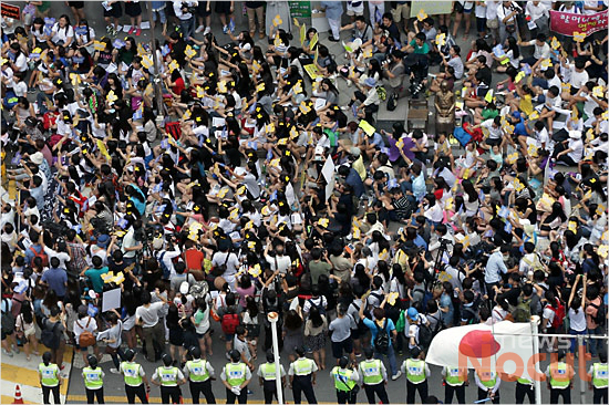 광복절을 하루 앞둔 14일 오후 서울 일본대사관 앞에서 수요 정기집회에서 참석자들이 일본정부의 위안부 문제 사과를 촉구하고 있다. 맞은편으로 일본대사관에 걸린 일장기가 펄럭이고 있다.