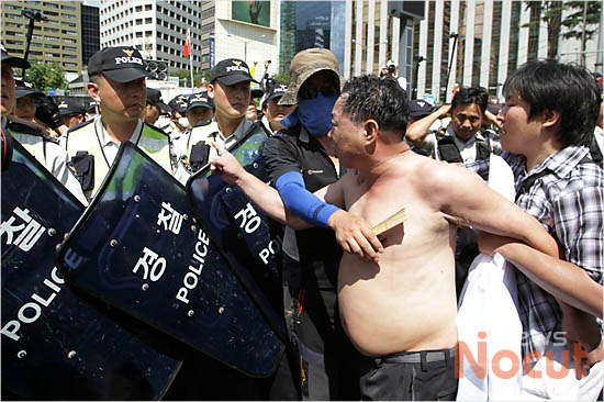 제68주년 광복절을 맞은 15일 오후 서울 을지로입구 네거리에서 경찰인 쏜 최루액을 맞은 한 진보단체 회원이 경찰에게 항의하고 있다.