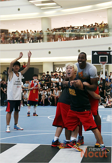 18일 오후 서울 영등포구 타임스퀘어 아트리움에서 열린 방송인 하하, 정형돈과 NBA 스타 드와이트 하워드의 농구 대결인 '드와이트 타임'이 열렸다. 드와이트 하워드가 정형돈과 하하를 붙잡으며 즐거워하고 있다.