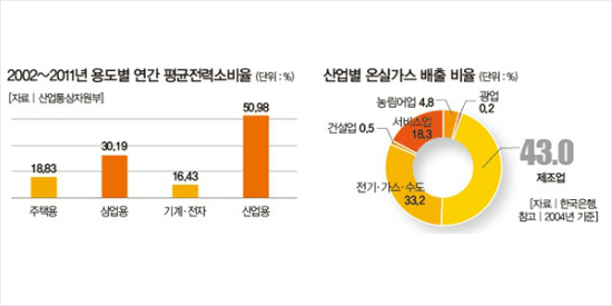 먼저 국내 전력소비량이 가장 높은 분야는 산업용과 상업용이다. 산업통상자원부에서 집계한 부문별 전력소비량 비중을 살펴보면 2002~2011년 주택용 평균전력소비량은 18.8%였다. 매년 20%를 넘어간 적이 없다. 반면 산업용은 매년 50% 이상이었고, 평균전력소비량은 51%였다. 상업용은 평균 30.2%에 가까운 전력을 소비했다. 나머지가 기계전자 부문(16.4%)이었다. 국내에서 생산하는 총 전력량의 80%가 넘는 전력을 산업용과 상업용으로 소진한다는 얘기다.