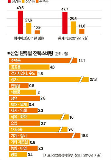 산업용 전력 중에서도 제조업(특히 기계ㆍ장비와 석유화학) 분야의 전력소비량이 48.7%로 가장 높았다. 같은 기간 하계ㆍ동계피크의 부하 비중은 산업용이 각각 49.5%와 47.7%로 가장 높았고, 상업용은 27.6%와 28.5%였다. 주택용은 10.9%와 11.6%로 비교적 낮았다. 계절별 전력부하가 주택의 전력소비량 때문에 발생하는 게 아니라는 얘기다.
