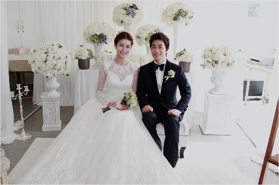 김정화는 여성스럽고 단아한 레이스가 돋보이는 순백의 웨딩드레스를, 유은성은 세련된 슈트 정장을 입어 아름다운 분위기를 연출했다.