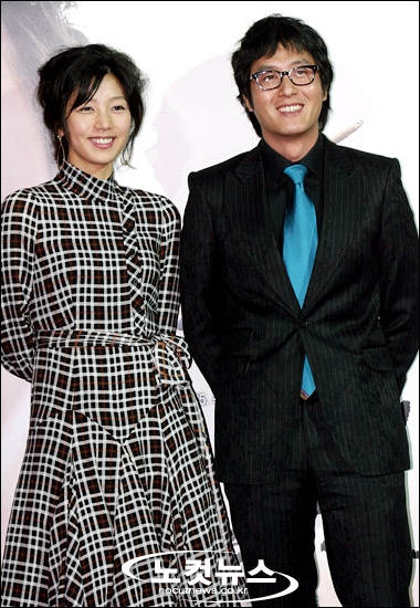 21일 오후 서울 코엑스 메가박스에서 열린 영화 ''청연''(감독 윤종찬 · 제작 코리아픽처스)의 기자간담회에서 장진영과 김주혁이 무대에 올라 다정하게 포즈를 취하고 있다.