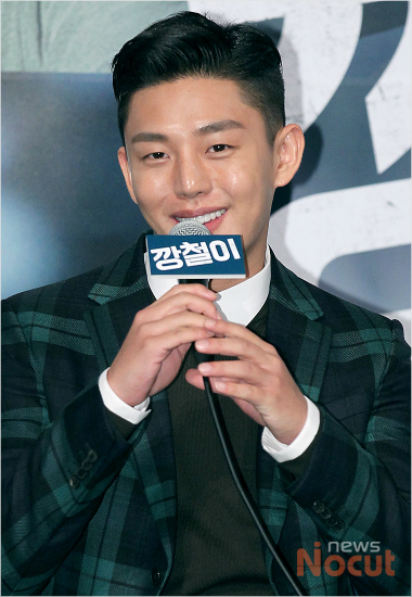 영화 '깡철이' 언론시사회가 25일 오후 서울 행당동 왕십리 CGV에서 열린 가운데 배우 유아인이 밝게 웃으며 취재진의 질문에 답하고 있다.