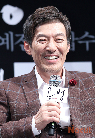 영화 '공범' 제작보고회가 26일 오후 서울 신사동 압구정 CGV에서 열린 가운데 배우 김갑수가 밝게 웃으며 기자간담회에 참여하고 있다.