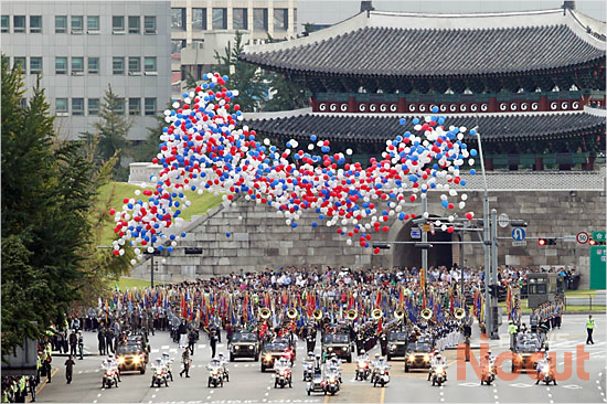 건군 65주년 국군의 날인 1일 오후 서울 세종대로에서 시가행진이 펼쳐지고 있다. 이번 시가행진은 지난 2008년 이후 5년만에 전차, 장갑차, 미사일과 4500여명의 병력이 참가, 서울역-서울시청-세종로-종각역 사거리-동묘앞 일대에서 펼쳐진다.