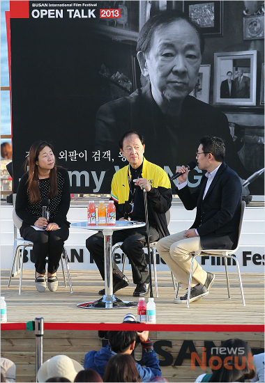 4일 오후 부산 해운대 비프빌리지 야외무대에서 열린 '전설의 외팔이 검객, 왕우' 오픈토크에 참석한 배우 왕우(가운데)가 관객들과 즐거운 시간을 보내고 있다.