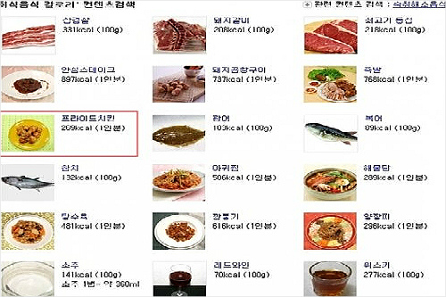 프라이드 치킨의 칼로리는 1인분 기준으로 269㎉인 것으로 드러났다. 이는 안심스테이크(897㎉), 깐풍기(768㎉), 족발(768㎉), 돼지곱창구이(737㎉), 탕수육(418㎉) 등과 비교했을 때 현격히 낮고, 해물탕(289㎉) 1인분 정도의 수준으로 파악됐다,