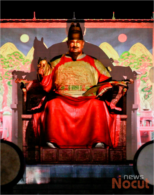 23년 만에 다시 공휴일이 된 한글날을 하루 앞둔 8일 오후 서울 광화문 광장에서 '2013 한글문화큰잔치의 밤'이 열린 가운데 미디어아트 기법을 통해 세종대왕상이 곤룡포를 입고 있는 것처럼 보이고 있다.