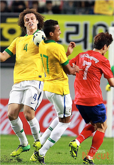 12일 오후 서울 월드컵경기장에서 열린 축구국가대표 친선경기 대한민국과 브라질의 경기에서 브라질 루이스와 구스타부가 볼다툼을 벌이고 있다.