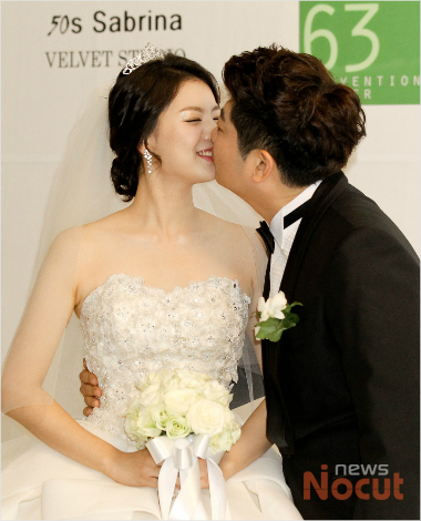 개그맨 김재욱이 20일 오전 서울 영등포구 여의도동 63시티 컨벤션홀에서 열린 결혼 기자회견에서 신부와 함께 포토타임을 갖고 있다.