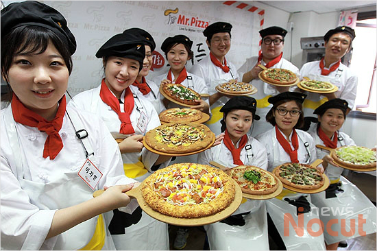 24일 오전 서울 연남동 연희전문학교에서 열린 미스터피자 ‘제7회 그녀들의 피자 콘테스트’ 본선에 출전한 참가자들이 다양한 재료를 가득 얹은 신메뉴를 들고 포즈를 취하고 있다.